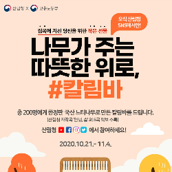 본 홍보 행사는 10월 21일(수) 오후 1시부터 15일간 산림청 유튜브, 페이스북, 인스타그램 등 누리 소통망(SNS)에서 진행하며, 영상 시청 후 ‘일상 속 나무가 나에게 주는 의미’에 대한 한 줄 댓글과 ‘#안녕숲칼림바’ 해시태그를 달면 참여가 완료됩니다.