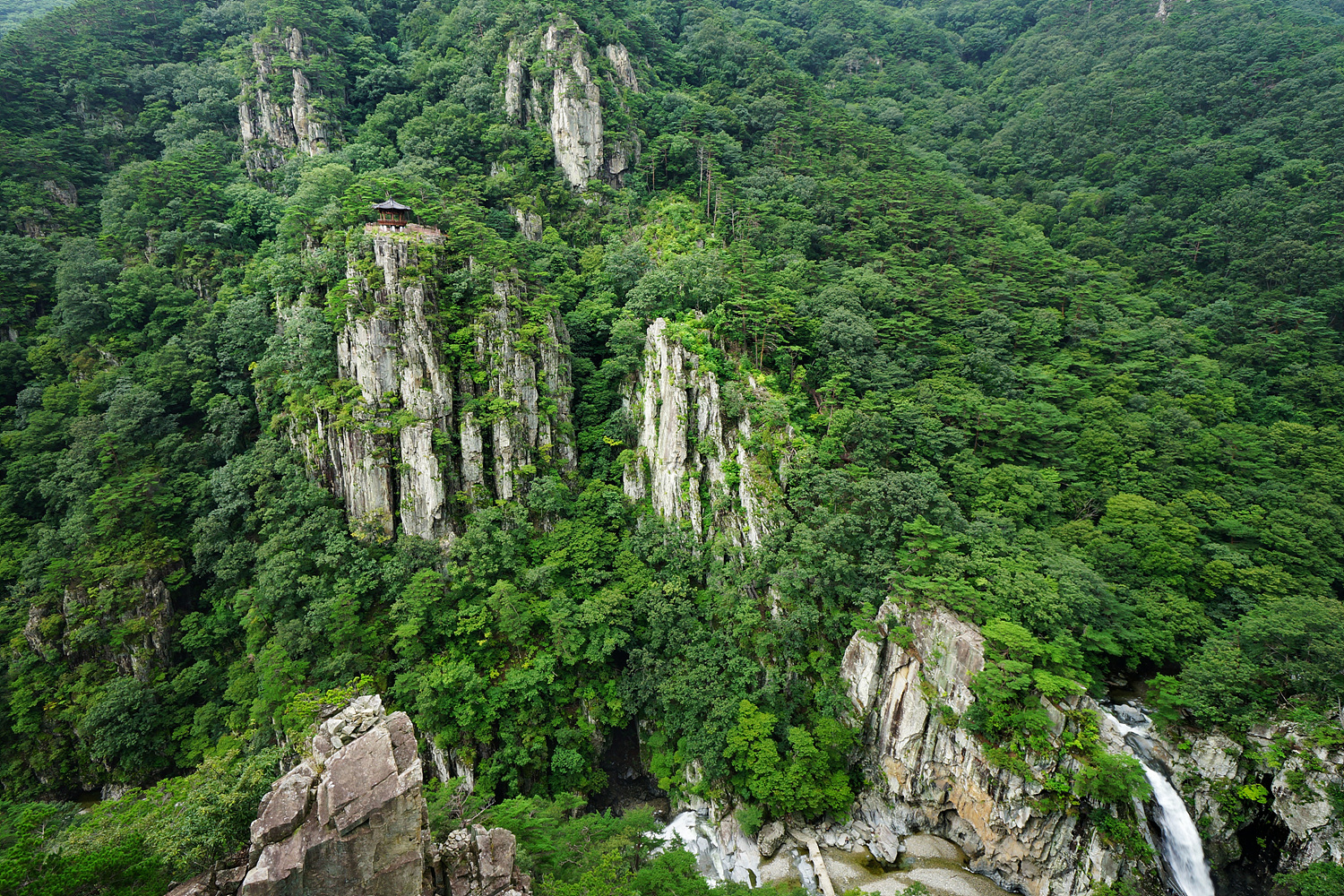 폭포의 물소리를 감상하면서 올라가다 보면 신선들이 노니는 곳처럼 착각이 들 정도로 거대한 바위산이 위엄한 자태로 소나무와 어울려 멋진 한 폭의 동양화를 그려내는 선일대가 보입니다.