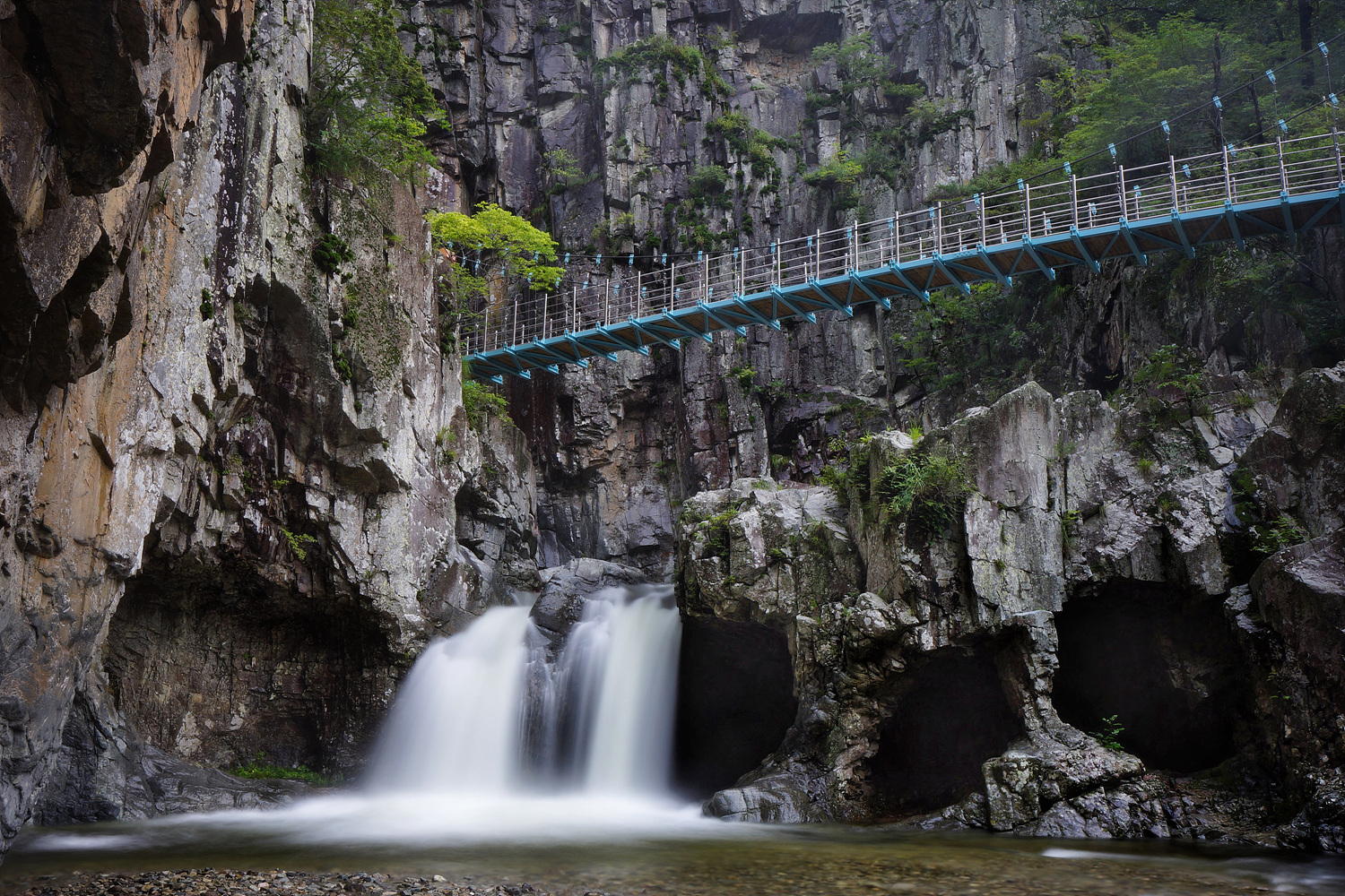 내연산 폭포의 아름다움을 대표하는 관음폭포와 구름다리입니다. 하늘 높이 솟아오른 학소대와 비하대 옆으로 쏟아지는 관음폭포의 풍경은 어디를 내 놓아도 손색이 없는 절경이고 또한 동그랗게 뚫린 3개의 바위굴은 자연이 만들어 낸 신비한 모습으로 경북의 지질공원에 포함되어 있지요.