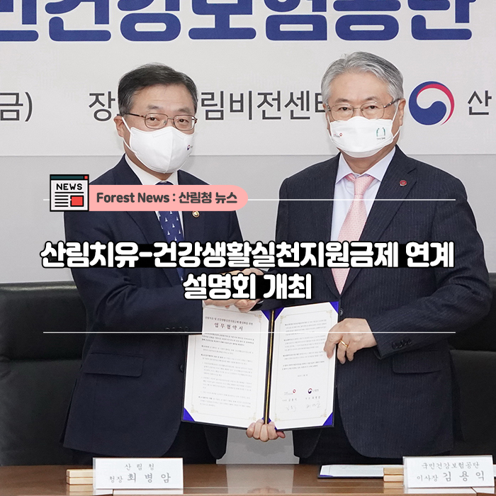 산림청은 지난 12월 3일 국민건강보험공단과 체결한 산림치유-건강생활실천지원금제 업무협약을 이행하기 위하여 전국 17개 시‧도 및 치유의 숲 관리를 담당하는 시‧군의 산림치유 관계자를 대상으로 10일 설명회를 개최하였습니다.