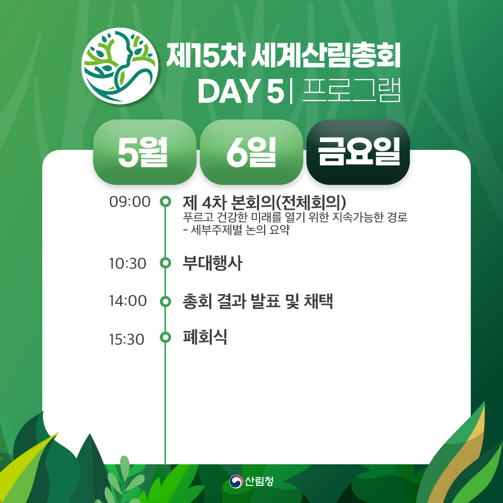 오늘은 5월 6일(금) 제15차 세계산림총회(WFC)의 마지막 날