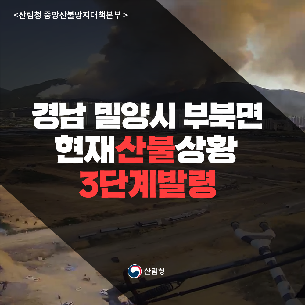산림청 중앙산불방지대책본부는 5월 31일 09시 25분 경남 밀양시 부북면 춘화리 산41 일원에서 발생한 산불의 확산을 막고 신속한 진화를 위해 11시 45분을 기준으로 「산불 3단계」 및 산불국가위기경보「심각」 을 발령 한다고 밝혔다.