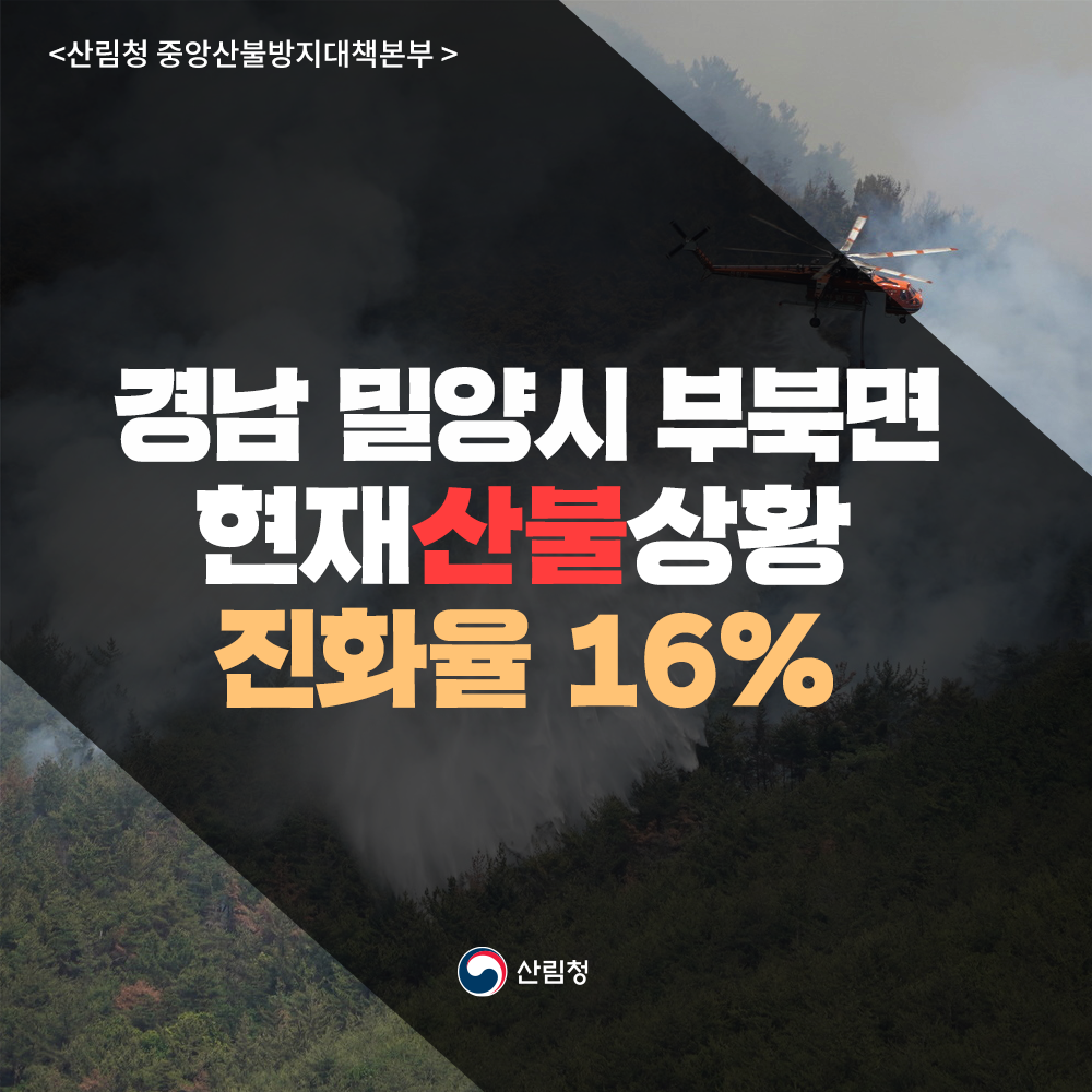 산림청 중앙산불방지대책본부는 5월 31일 09시 25분 경남 밀양시 부북면 춘화리 산41 일원에서 발생한 산불을 진화하기 위해 산불진화헬기 44대(산림 26, 국방 12, 소방 6대)와 산불진화대원 1,604명(산불특화대원 등 188, 산림공무원 602, 소방 381, 기타 433)을 동원하여 총력 대응 중이며 18시 기준 현재 진화율은 16%이며 산불영향구역은 187ha로 추정하고 있다.