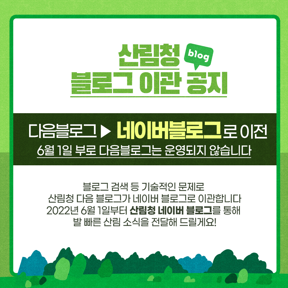 | ※ 블로그 이관 공지 ※ 블로그 검색 등 기술적인 문제로 산림청 다음 블로그가 네이버 블로그로 이관을 합니다. 2022년 6월 1일부터는 산림청 네이버 블로그를 통해 발빠른 산림 소식을 전달해드릴게요! ★ 새로운 산림청 네이버 블로그 바로가기 → https://blog.naver.com/forest_news |